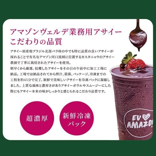 【アマゾンヴェルデ】は他のフルーツなどの混ざりものなし、ガラナシロップで甘さを加えた加糖タイプのアサイーピューレ。アサイー本来の濃厚な味わいをお楽しみいただけます。