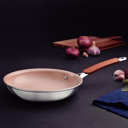 トラモンティーナ「ロマグナ フライパン セラミック ベージュピンク」は、 ステンレスとアルミを組み合わせた2層構造で、優れた熱伝導と美しい デザインを両立。 内面のアイボリーセラミックコーティングが、ヘルシーで焦げ付きにくい 快適な調理を実現します。