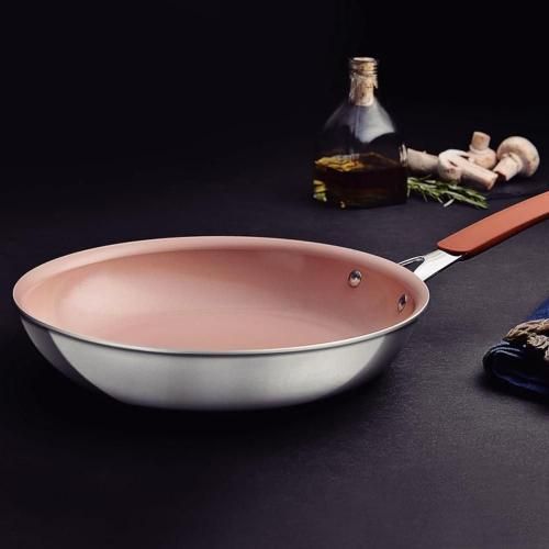 トラモンティーナ「ロマグナ フライパン セラミック ベージュピンク」は、 ステンレスとアルミを組み合わせた2層構造で、優れた熱伝導と美しい デザインを両立。 内面のアイボリーセラミックコーティングが、ヘルシーで焦げ付きにくい 快適な調理を実現します。